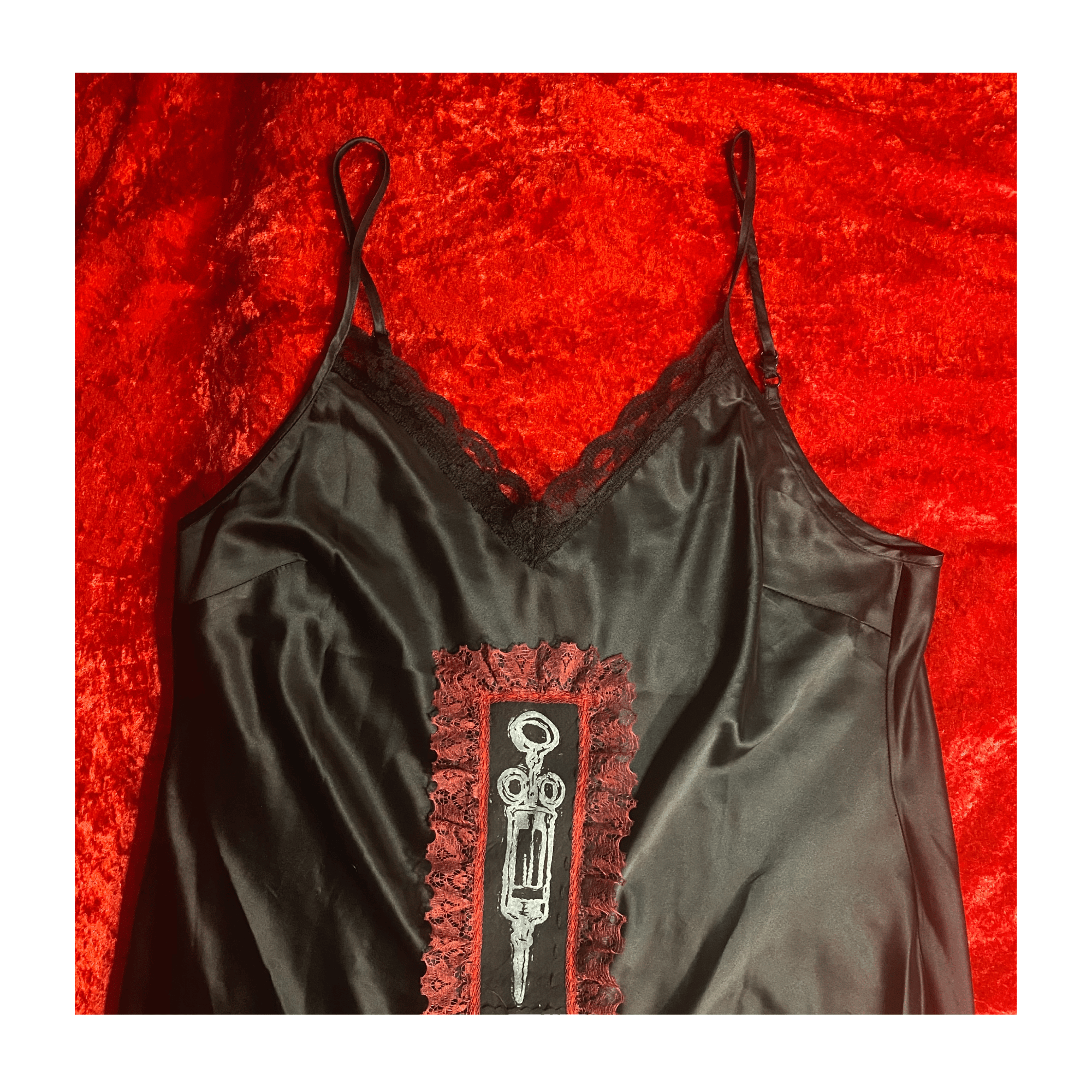 Silky slip dress with burgundy lace trimmed syringe cross and a lace hemmed leg split.