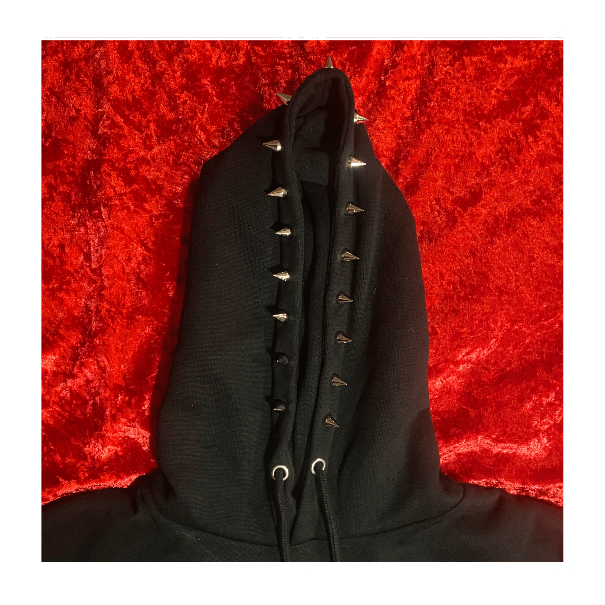 Features screenprinted design hand drawn by The Twink of Darkness, screenprinted by Obscure Clothing Ltd, three D rings (two at the front, one at the back) on the bottom of the hoodie, red lace around the cuffs and chunky spikes surrounding the hood.